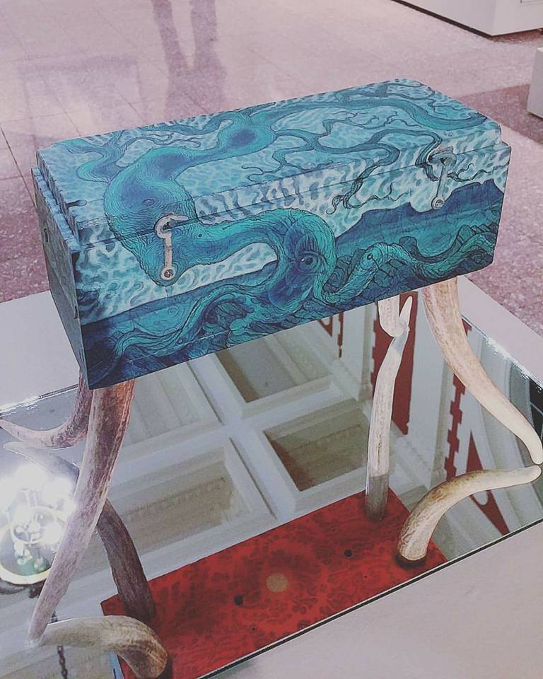 Inside The Mesa – Mixed media Inside the Mesa was conceptualized during a three day backpacking trip in Cedar Mesa, just south of The Bear’s Ears Buttes. The organic media used were collected from pieces of the Desert life cycle. The elk antlers were bleached by the sun, having been shed by the animal the previous year. I carried them on my back for over 20 miles. The Juniper berries had ripened and naturally dried. No animals or plants were harmed. That is important to me and to my process. I believe that the part I play in my interaction with the wilderness is that of a respectful observer, not an interloper. My endeavor in this piece is to bear witness to the landscape I encountered during my hike in Cedar Mesa; the billowing clouds, the twisted Junipers, the wind and ceaseless movement of the parched ground, all set at the base of the static out line of the Bear’s Ears. I saw a continuity and equivalency between my own life experience and the cycle of life and death playing out around me there. I spent my childhood in the desert camping and hiking with my late father, where he had spent his childhood hiking and camping with his father. My father died in the desert, and was buried there. It is a part of me, and I hope, respectfully, that I am a part of it as well.