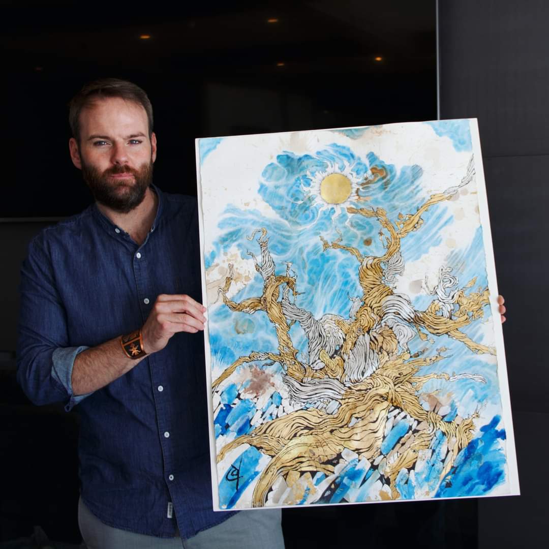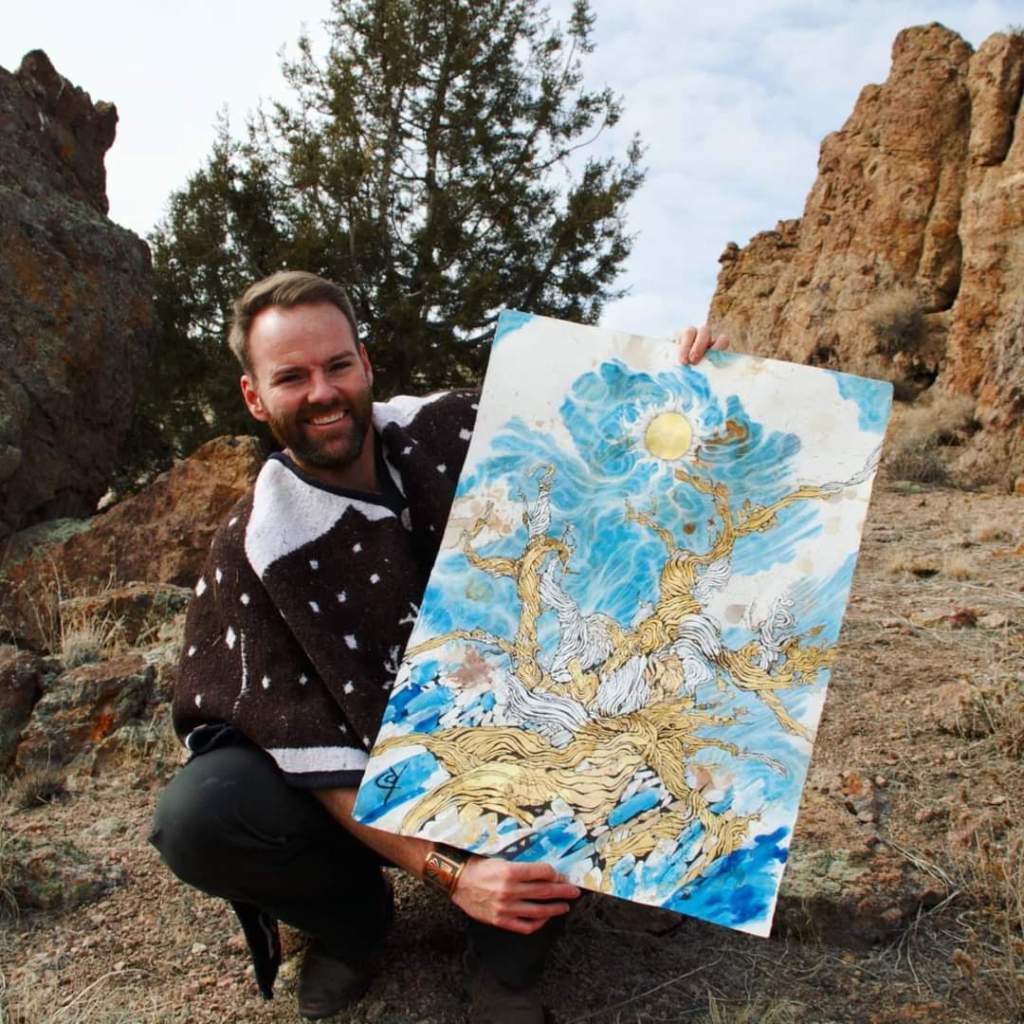 All done! While searching for the perfect backdrop for a photo with my recently finished drawing, I found myself walking along a ridgeline scattered with lichen covered stones and junipers. After setting up for the shot, I dropped low to the ground with my drawing and noticed what looked like a tiny flake of dark glass between my boots. I picked it out of the dirt and to my great surprise, saw it was an obsidian arrowhead! Right under me was a piercing reminder of how alive the desert is, a reminder that I’m just a visitor lucky enough to roam this paradise. This moment was more amazing considering I had drawn projectile points throughout this work, and titled it ” Flint, Juniper, Sky”. After a few photos I placed the petite artifact back where it was laying, pondering my place in relation to the tryptic of “Flint, Juniper, Sky”Gold and silver leaf, ink, coffee and tea, and watercolor on paper. 22×30”