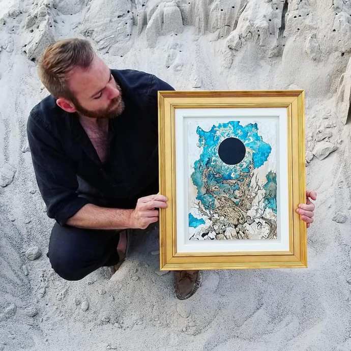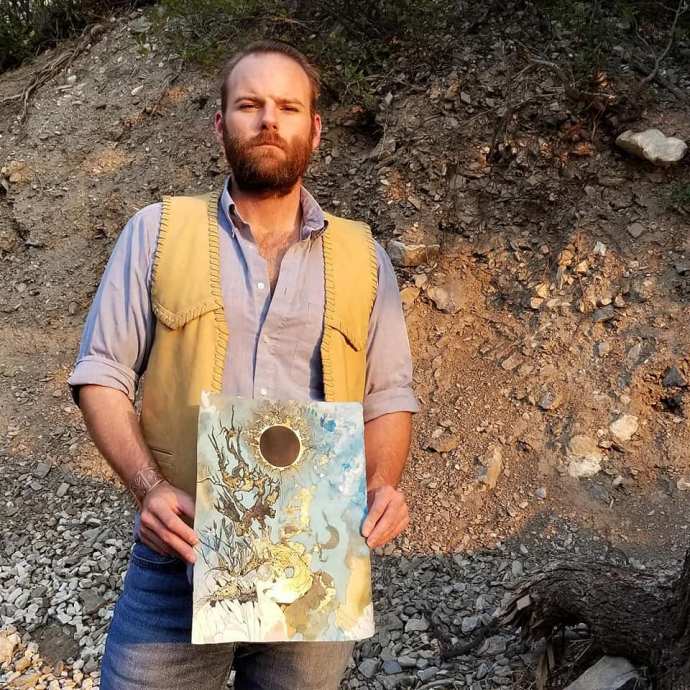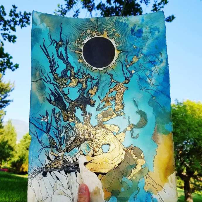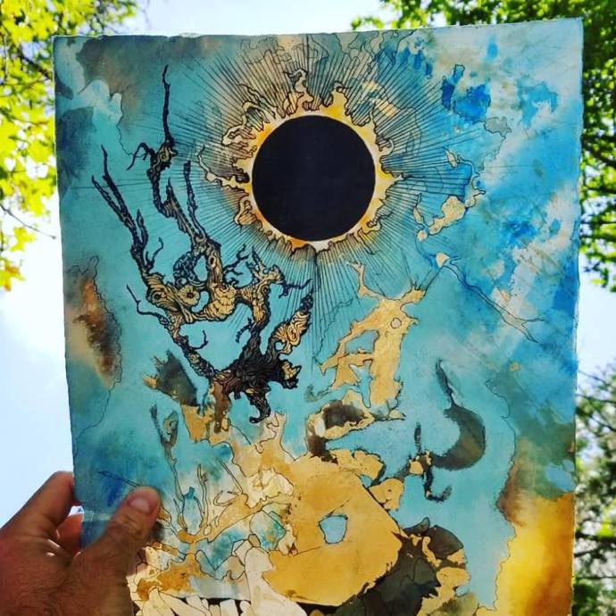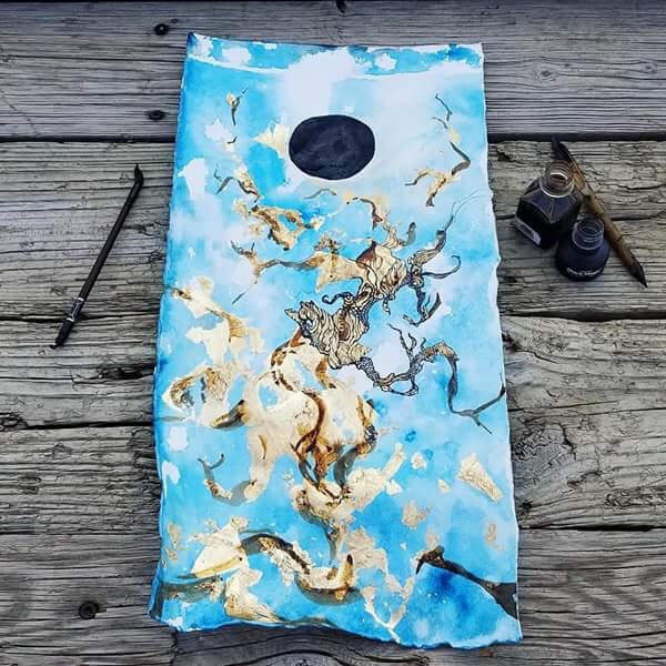Ink, blue dye, gold leaf on coffee&tea paper. 11×15